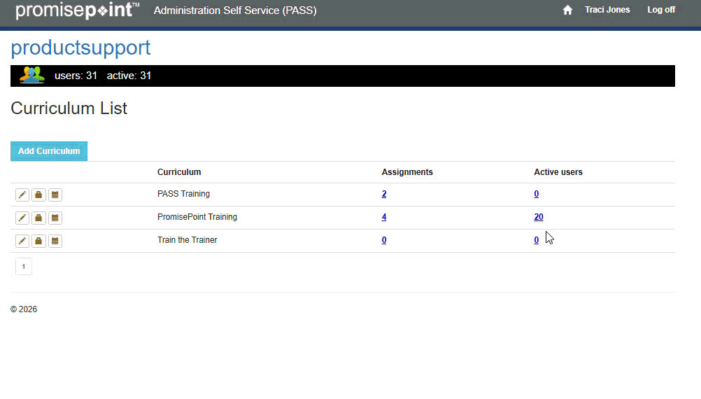 - Locate the desired curriculum; then click the corresponding blue hyperlinked number in the Assignments column.